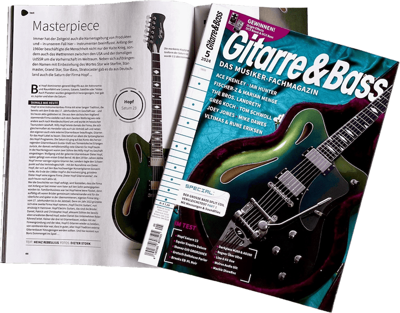 Gitarre & Bass 5/2024 | GITARRE & BASS (gitarrebass.de) - Hier zur portofreien Heftbestellung: "Die Hopf Saturn 23 ist eine großartige Gitarre, meisterhaft von Boris Dommenget auf der Design-Grundlage der Hopf 63 gebaut und mit all dem ausgestattet, was eine Boutique-Gitarre aus dem obersten Regal bieten muss - und mehr! Ausgesuchte Materialien wie die massiven Hölzer, die per fachkundiger Handarbeit in Form gebracht werden, wie die patentierten Pickups, die authentische Humbucker- und Singlecoil-Sounds ermöglichen, und wie die von Dommenget entwickelte Schaltung mit The Brain als Kern, die vielfältigste Klangmöglichkeiten zur Verfügung stellt. Dass die Hopf Saturn 23 sich dann auch noch superb spielen lässt, hervorragend aussieht und extrem souveräne Sounds abliefert, ist die Kirsche auf dieser Torte [...]"