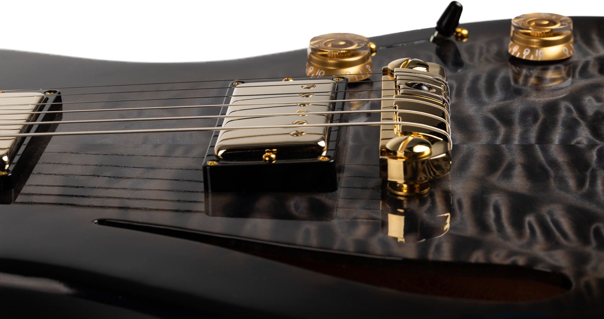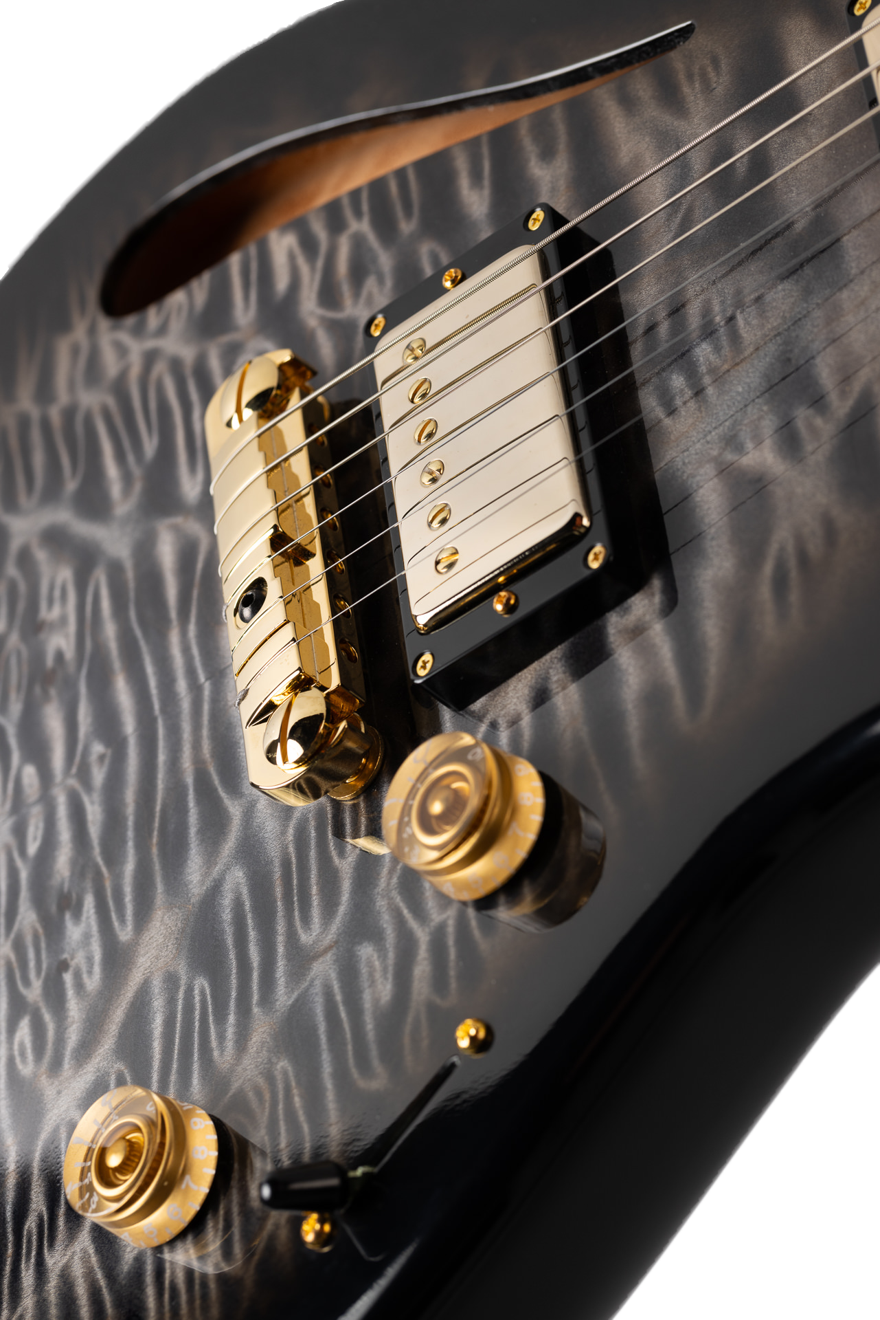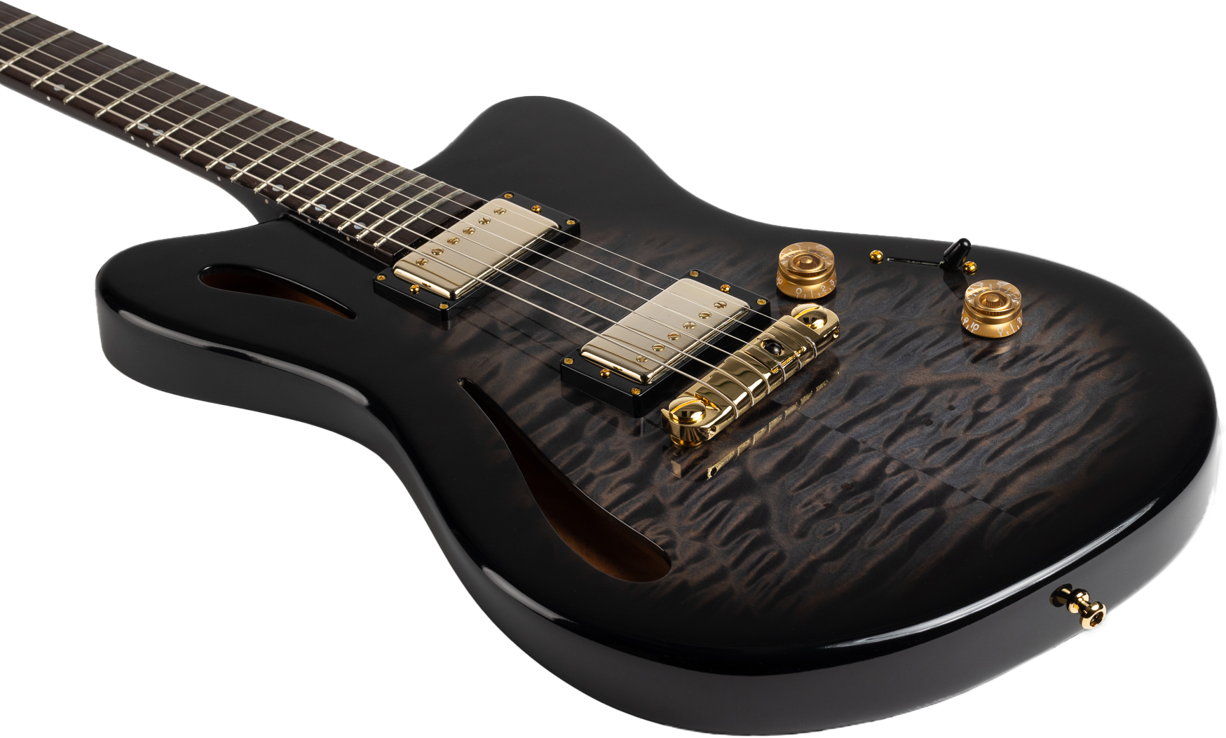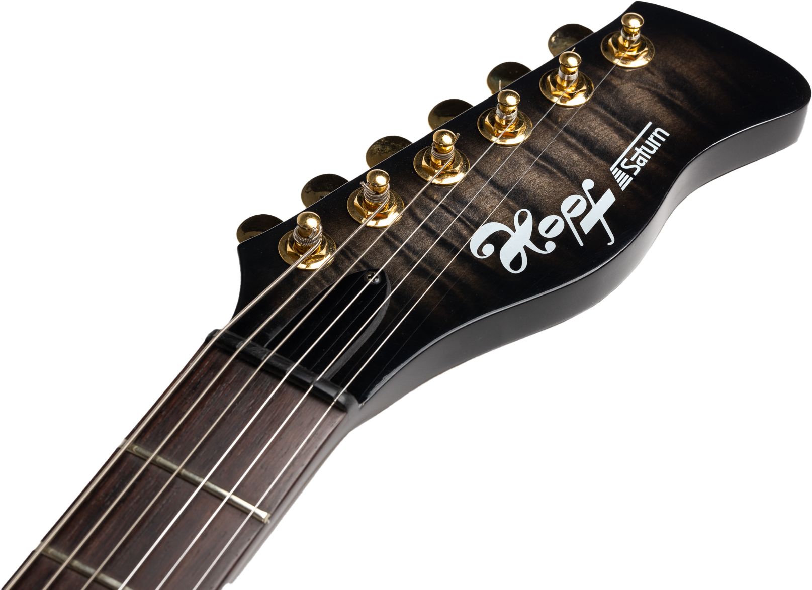 Resonate blues & rock tones through a solid mahogany body with a glued-in mahogany neck featuring a Madagascar rosewood fretboard…dream of nights in black velvet with the Saturn SB’s extraordinary, quilted maple top.